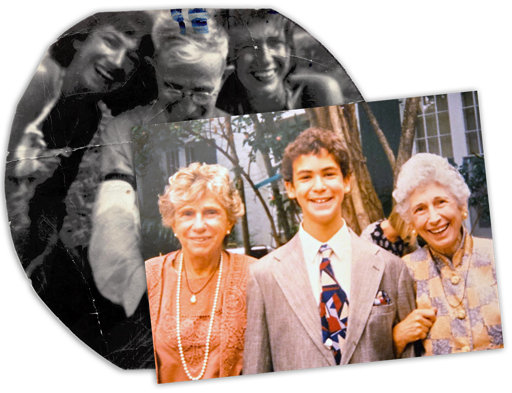 In black and white: Sarah (left) and Red with their father, Simon Ragovin, circa 1954. In color: Red (left) and Sarah with Red’s grandson, Sarah’s great nephew, my brother, Joe, at his bar mitzvah in 1995.